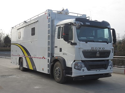 该车选用**重汽汕德卡牌二类底盘为平台改装而成。在驾驶室顶部 安装有导流罩,厢体设计有铝合金登顶梯,方便人员登顶检修、瞭望,车 顶四周装配装饰套件,使整车外观轮廓和线条更加美观圆润、动感流畅。